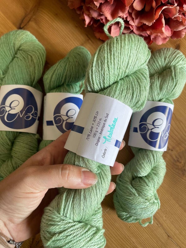 Écheveau de Laine biologique certifiée (70%) et lin (30%) – fil doux et respectueux de l’environnement.