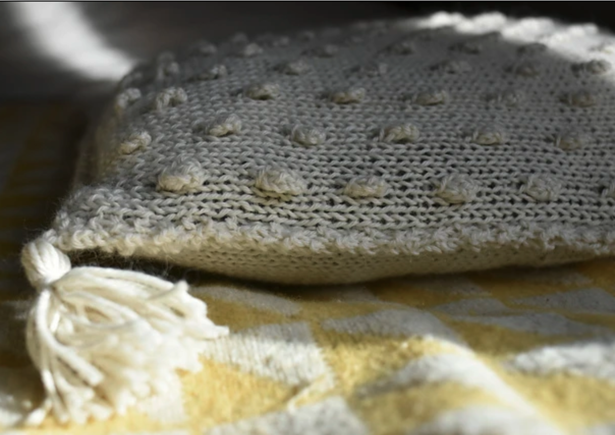Soft Bubble est une housse de coussin tricotée en point texturé en allers-retours. L’endroit est en point noppe, l’envers en jersey et côtes.