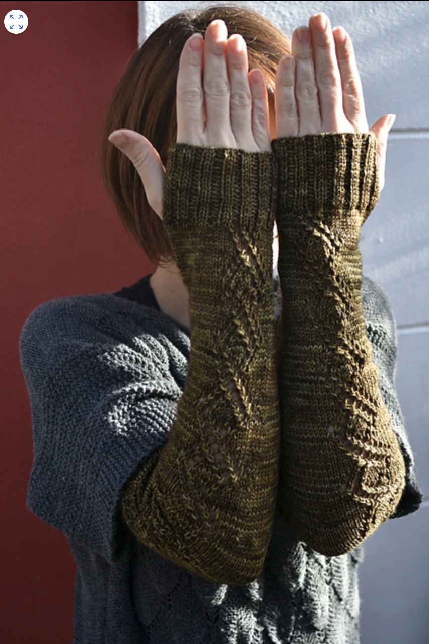 … une version longue, originale, assez habillée, qui met en valeur la laine que vous choisissez, que vous pouvez porter sur bras nus ou superposées sur vos habits, étirées ou retroussées pour varier les rendus.