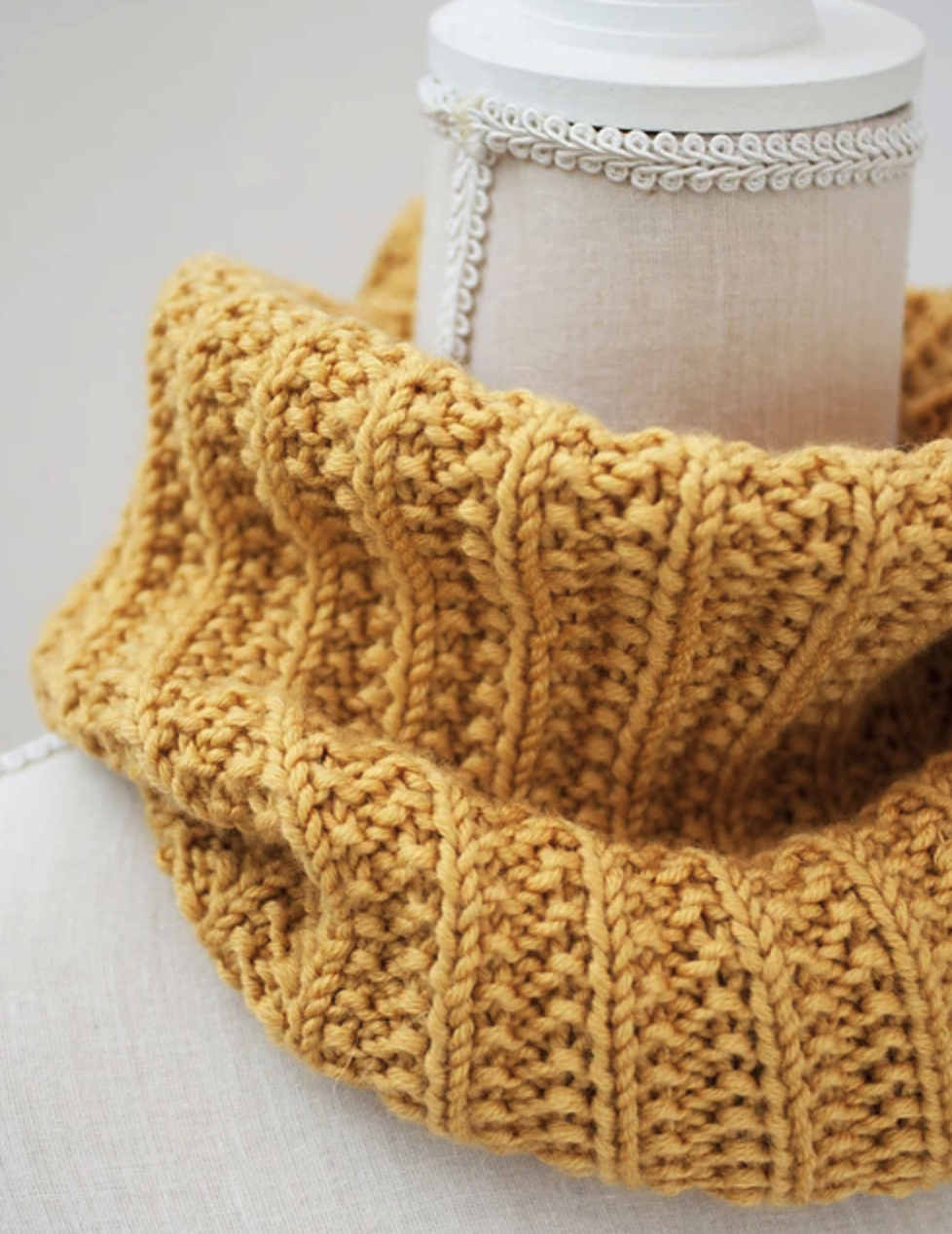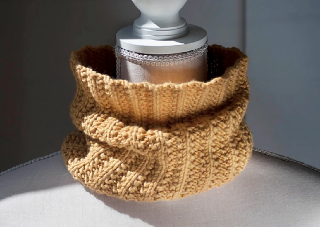 Il peut se tricoter avec des aiguilles droites ou circulaires n°5 mais se tricote à plat. On joint ensuite en rond par une couture.