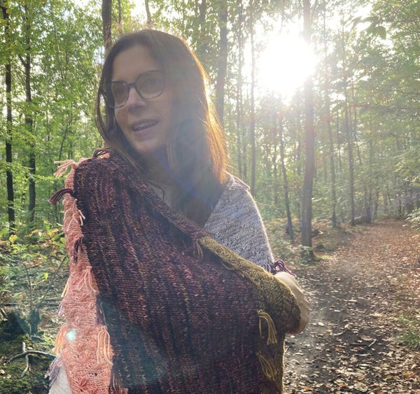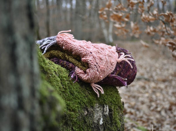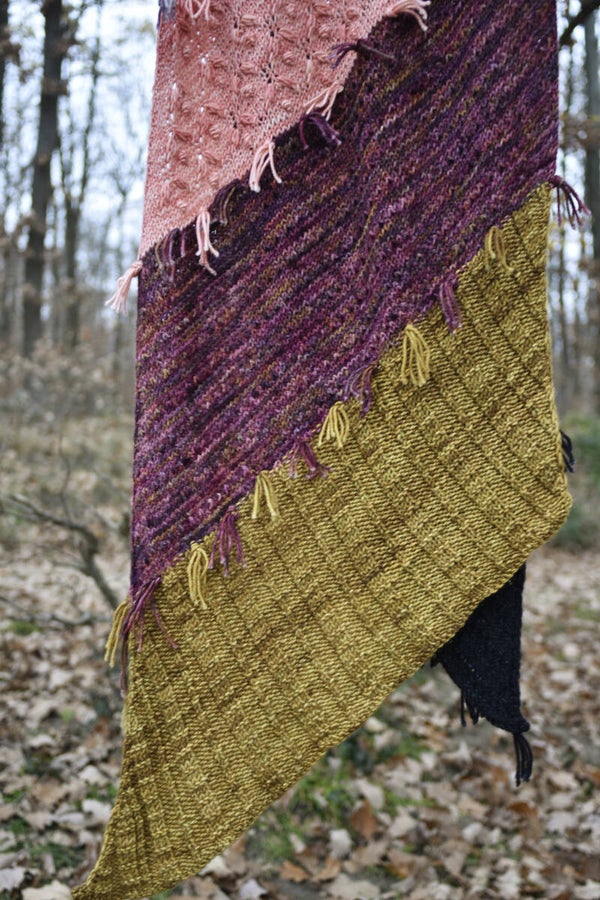 L’étole Brianna se tricote en allers-retours en color-block. Chaque bloc présente un point texturé particulier. Un jeu d’augmentation et de diminutions lui donne une forme asymétrique.
