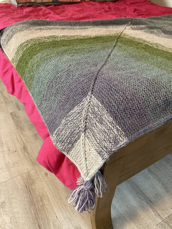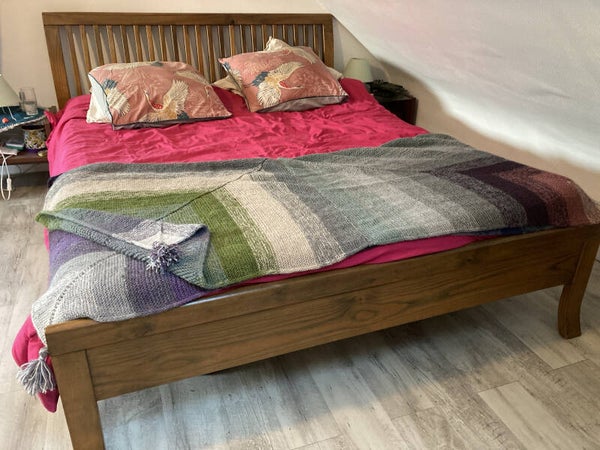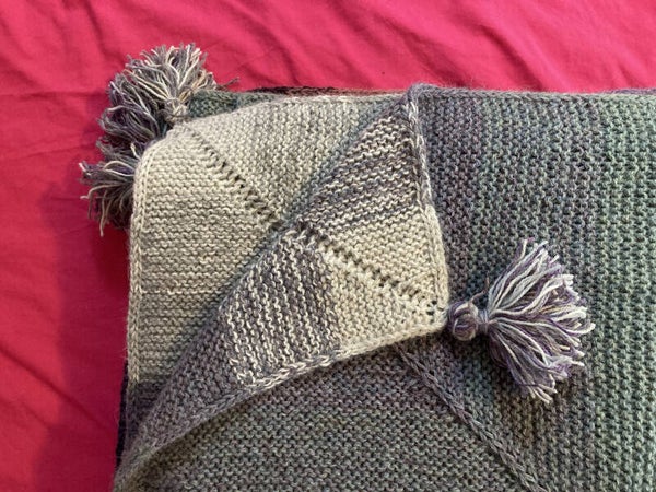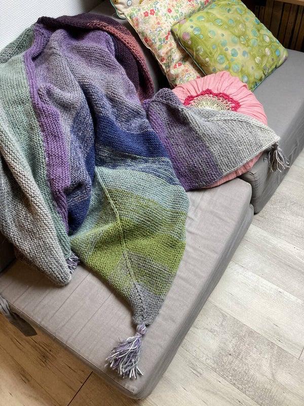 La couverture 20.20 se tricote fil en double en 4 blocs que l’on coud ensuite ensemble. Le dégradé de couleurs se fait en changeant un des deux brins de fil de façon régulière. Des finitions i-cord se tricotent au fur et à mesure de l’ouvrage.