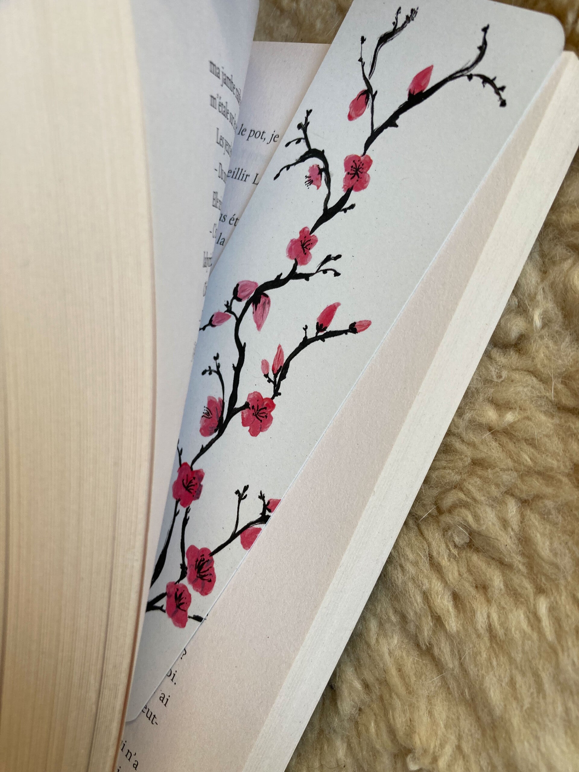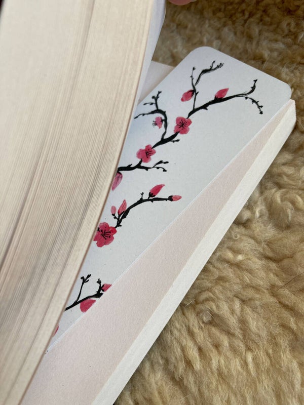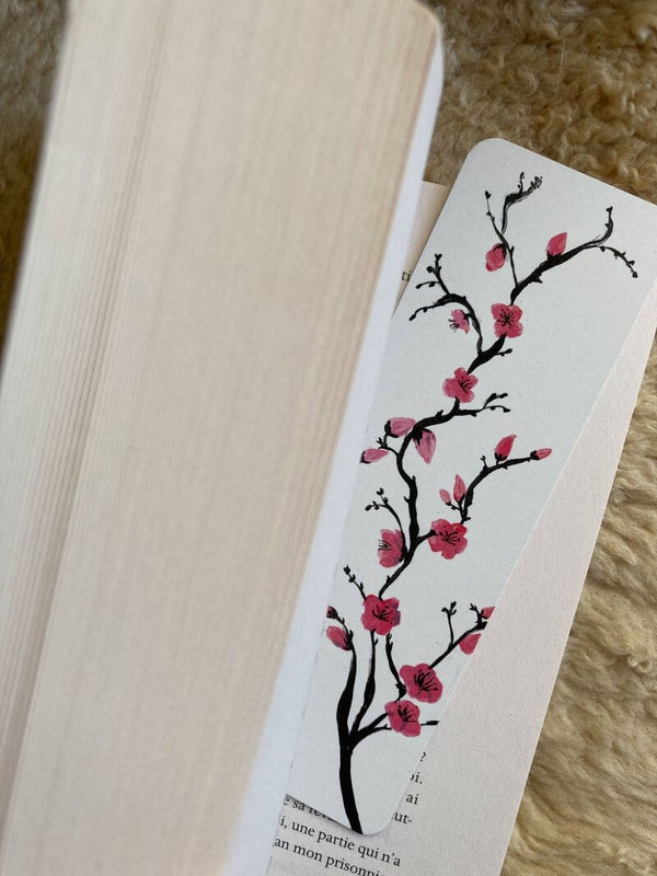 Marque-pages17,3 x 5,4 cmBords arrondisImprimé recto-verso fond blanc, fleurs de cerisiers sakura